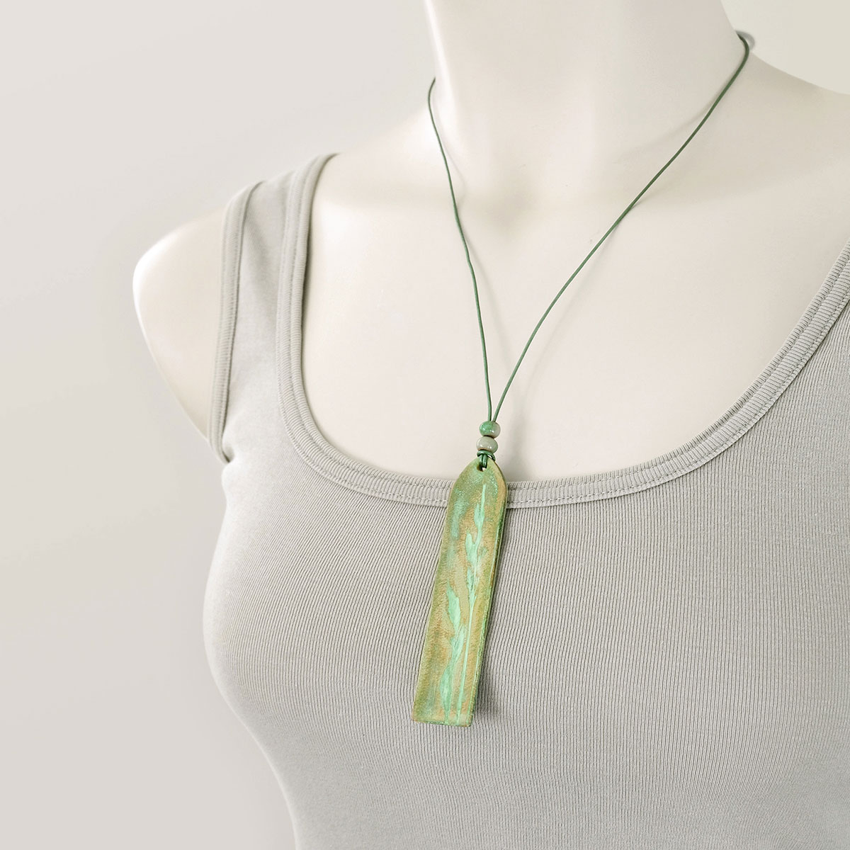 Handmade leather pendant with imprint of wild grasses, attached to an adjustable leather cord
