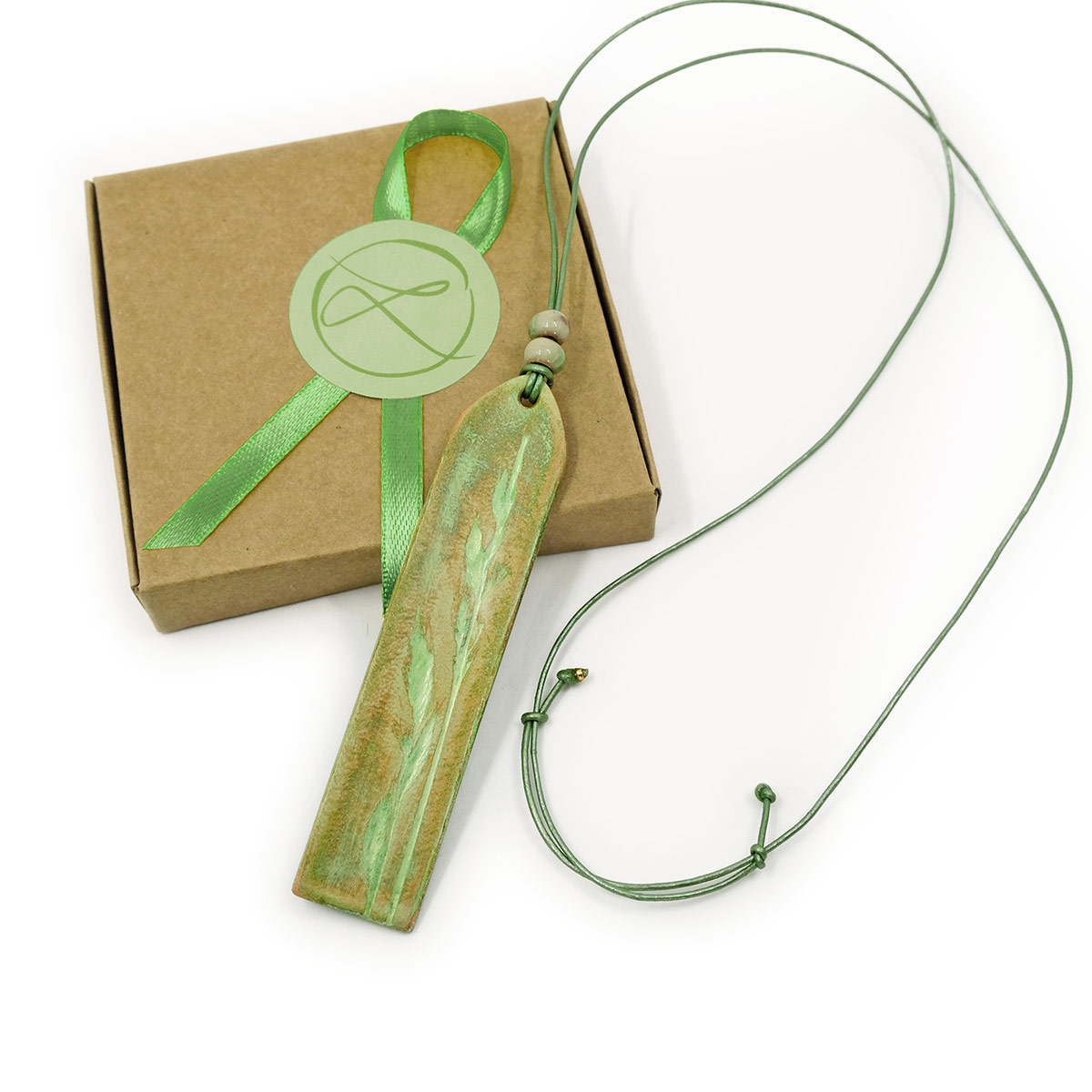 This beautiful boho style necklace is adjustable, maximum length is 47 centimeters (18.5 inches). The pendant is 2 x 9.5 centimeters (0.79 x 3.74 inches). It's adorned with two glazed porcelain beads that match the overall color of the necklace.