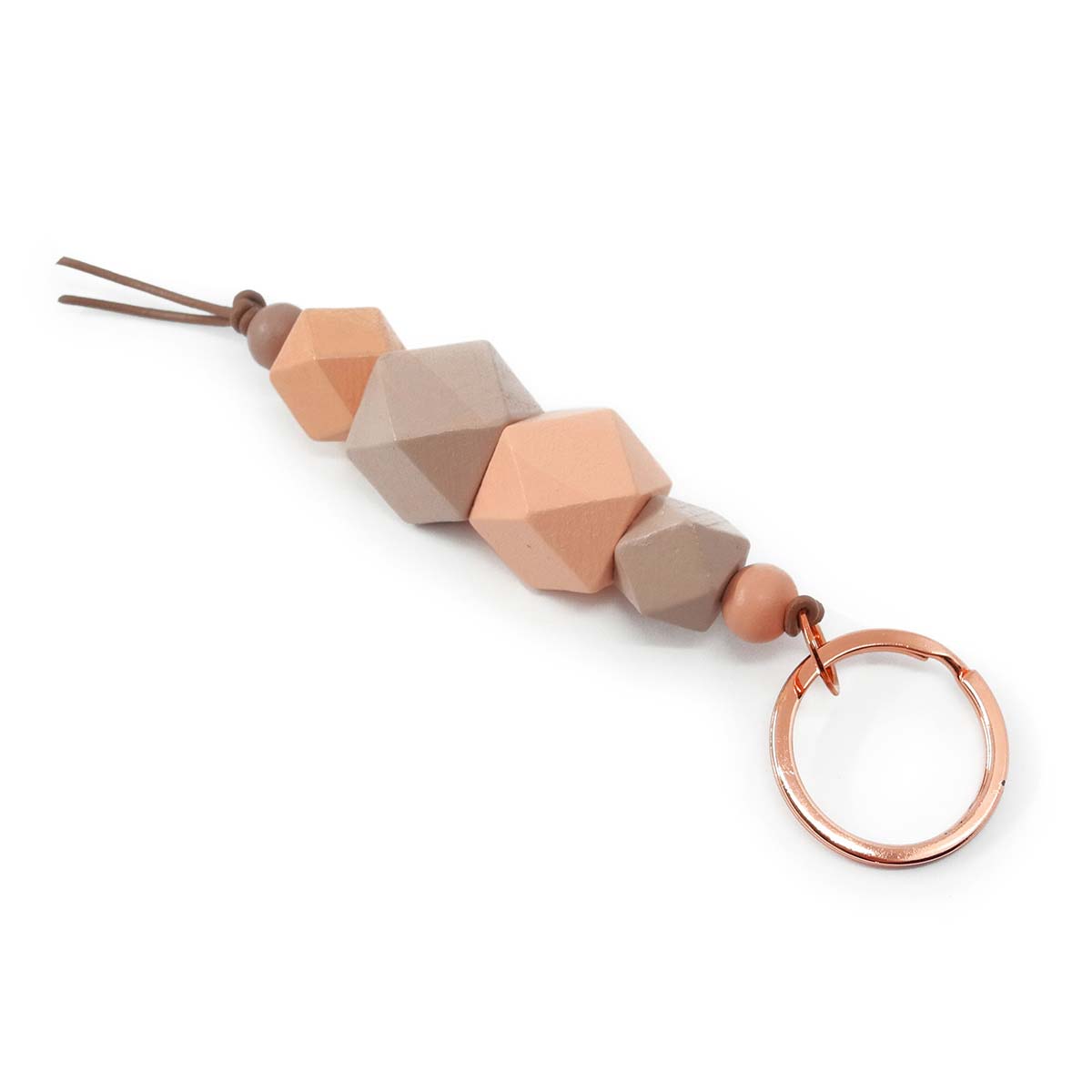 Delicate colors, natural materials, and a lovingly minimalist design: This handcrafted keychain made from hexagonal wood beads brings warmth and lightness to your everyday life. The harmonious combination of rose gold, powdery peach, and taupe lends your keyring a very feminine, softly organic look that pairs wonderfully with bags and accessories in natural tones.