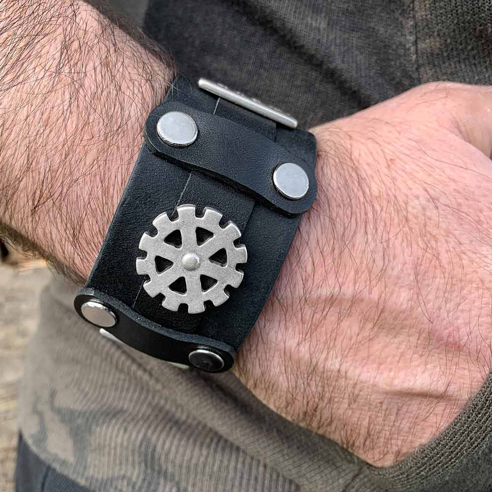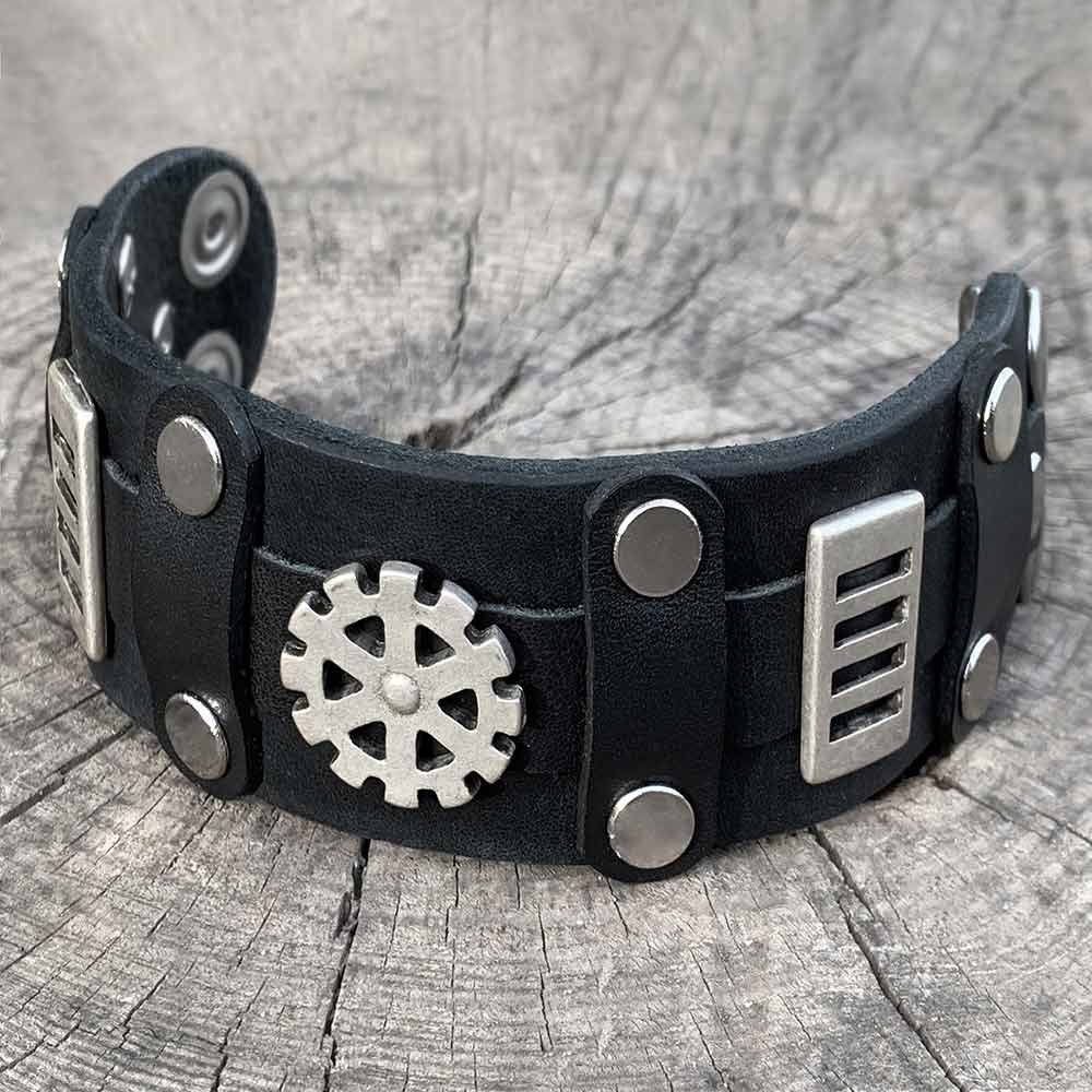 Men’s industrial style leather bracelet, a carefully handmade item, manufactured from strong yet supple vegetable tanned and oiled full grain leather, combined with steam punk inspired metal cog wheel / gearwheel ornaments and geometrical screw rivets. Please note that leather is a natural material and that these bracelets are handmade one-of-a-kind items. Slight color deviations are possible or wanted – therefore, each of these carefully crafted bracelets is unique.