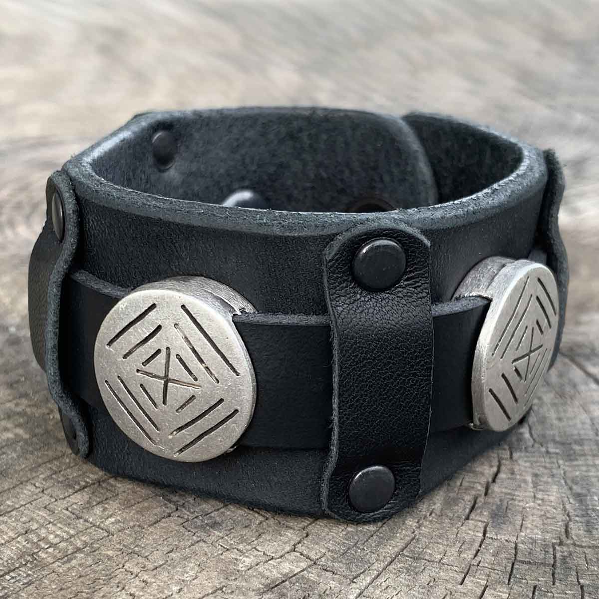 Men’s leather bracelet, manufactured from strong yet supple vegetable tanned and oiled full grain leather, combined with metal sliders and black rivets.