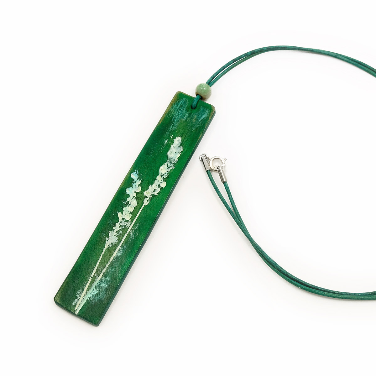 - Pendant with natural grass imprint and ceramic bead with craquelé glaze